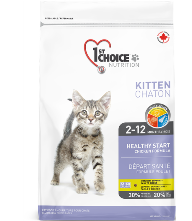 Our 1st Choice Healthy Start formula is the best possible initiation to dry food after their weaning period. A calcium-rich formula to build strong bones, fatty acids for optimal development of vital organs as well as prebiotics to ensure a strong immune system. All kitten deserve a healthy start for a long life!